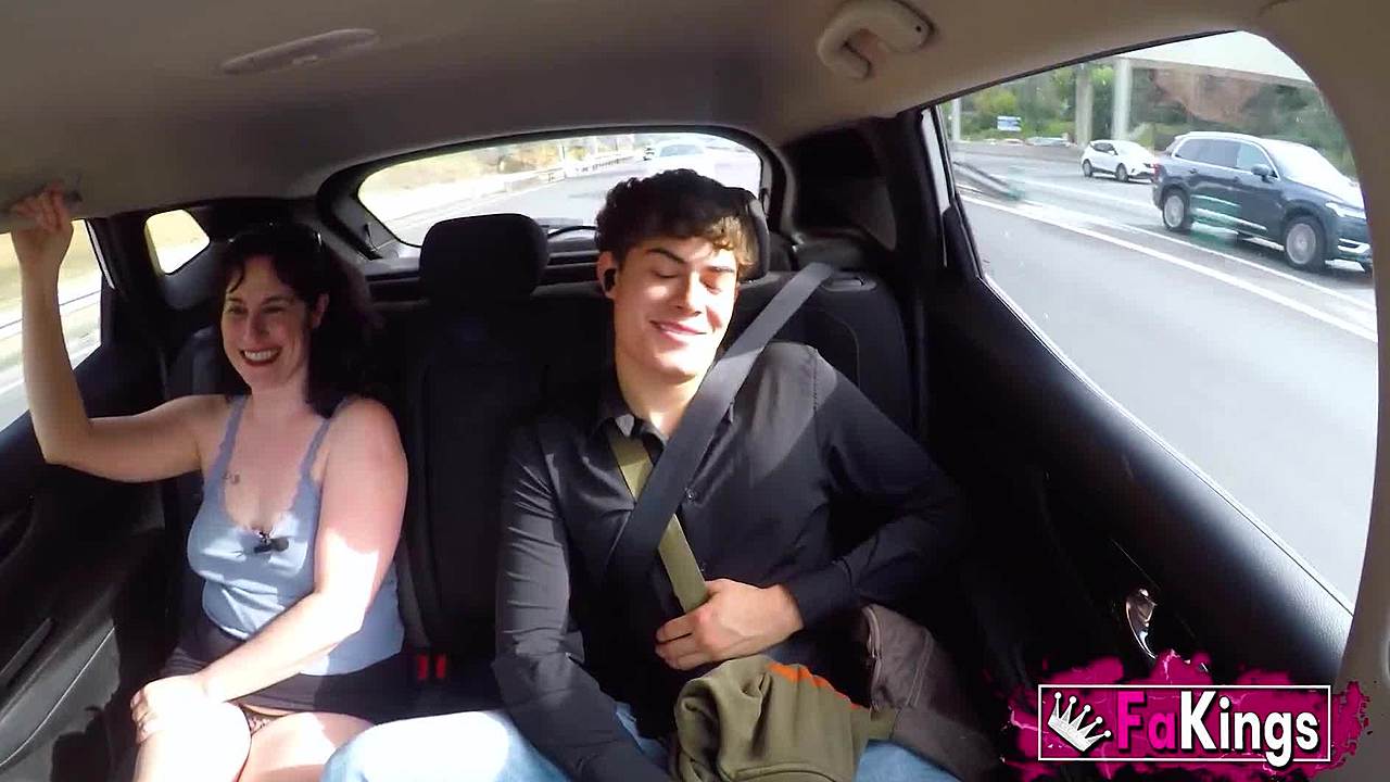 chubby cute girl tears pantyhose to toy her wet pussy in a taxicab while sucking dildo